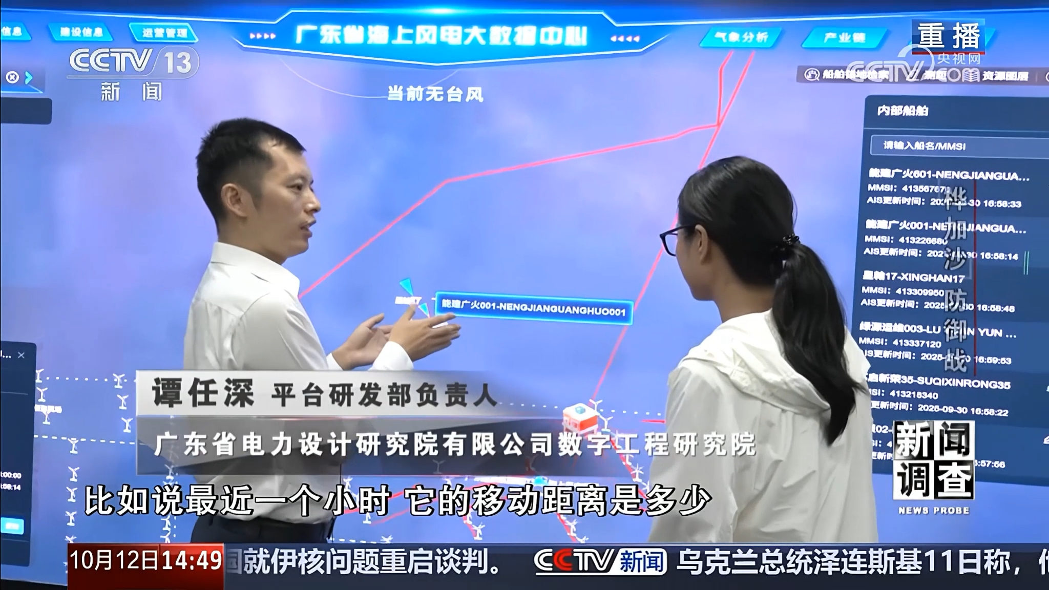 廣東省電力設(shè)計研究院有限公司數(shù)字工程研究院設(shè)計總工程師譚任深:所有船的位置都在這個平臺上面,您可以看到這里面很多綠色的一些形狀,就是三角形,這其實每個三角形就是一條船。它的位置我們實時看到,比如說最近一個小時它的移動距離是多少,然后我們現(xiàn)在通過這個技術(shù)手段,我們可以去監(jiān)測米級的移動。